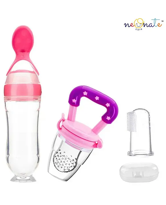 Fruit And Food Nibbler Feeder and Finger brush with Tongue Cleaner – Pack of 3 ( Fruit feeder Pink – Spoon feeder Pink – Finger brush White) ( color and design may vary)