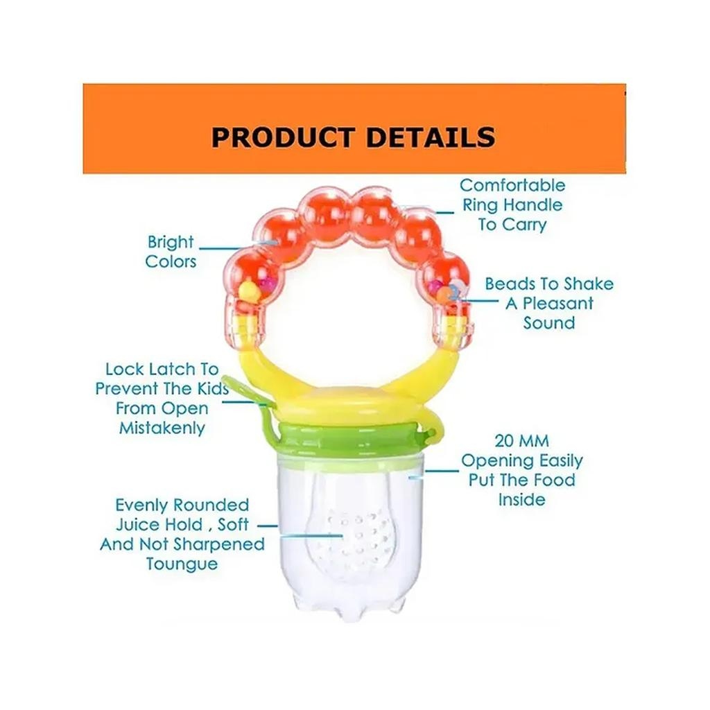 Easy To Carry: Includes Case For Easy Storage Or Travel. Safety First: Approved And Recommended By Leading Pediatricians. Made From 100 Percent Non-Toxic And Bpa Free Super-Soft Silicone Materials. With fruit and food nibbler, your child can safely enjoy fruit and other kinds of whole foods. Without the risk of choking or hurting his/her mouth. COLOR MAY VARY. This fruit nibbler ensures that your bundle of joy learns to eat the right way. The fruit nibbler has a safe silicone teat that is just the right size to ensure that the food is transferred to the baby’s mouth in small, manageable portions allowing him to gradually get used to the texture and feel of solid food. Since the fruit nibbler transfers the food in smaller bits, the risk of a big lump choking your baby is reduced vastly making for a safe eating experience. It also has a rattle for baby’s fun and also teething purposes. The print and colour of the product may vary according to the availability of the product.