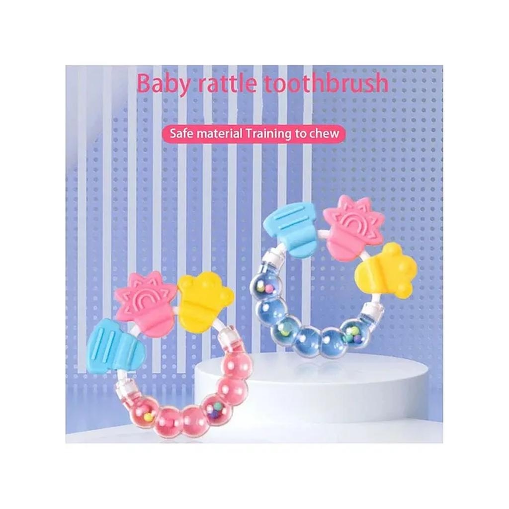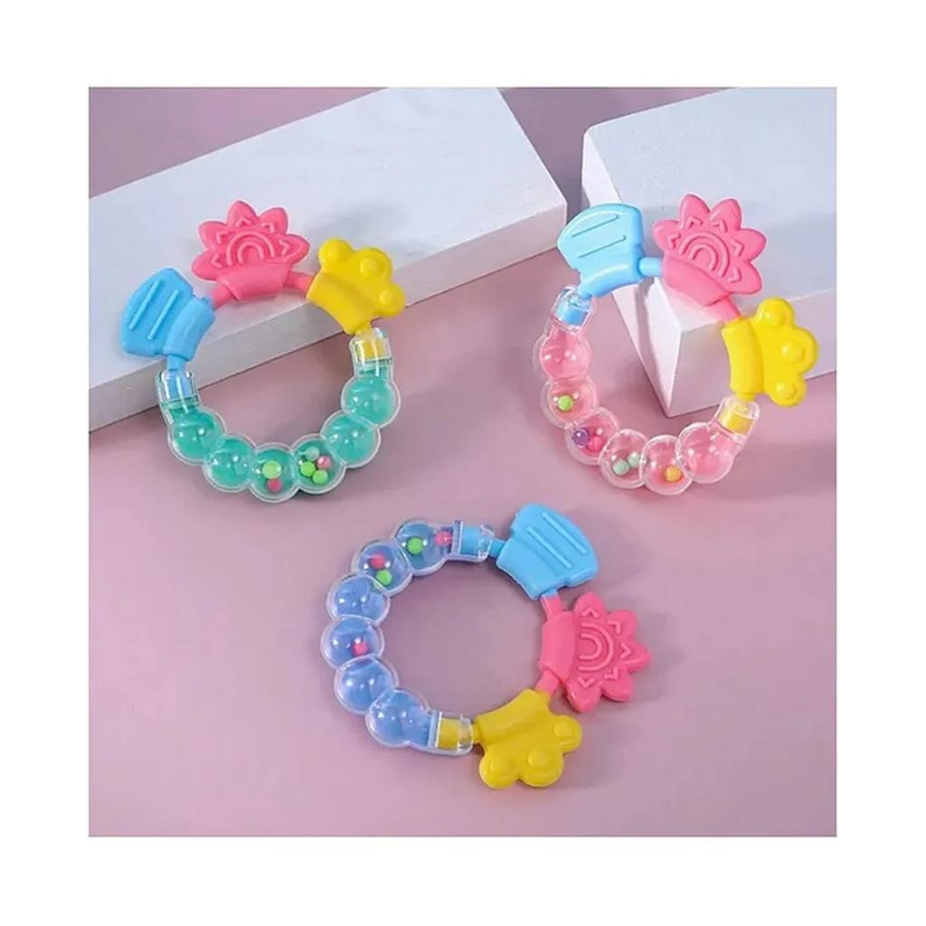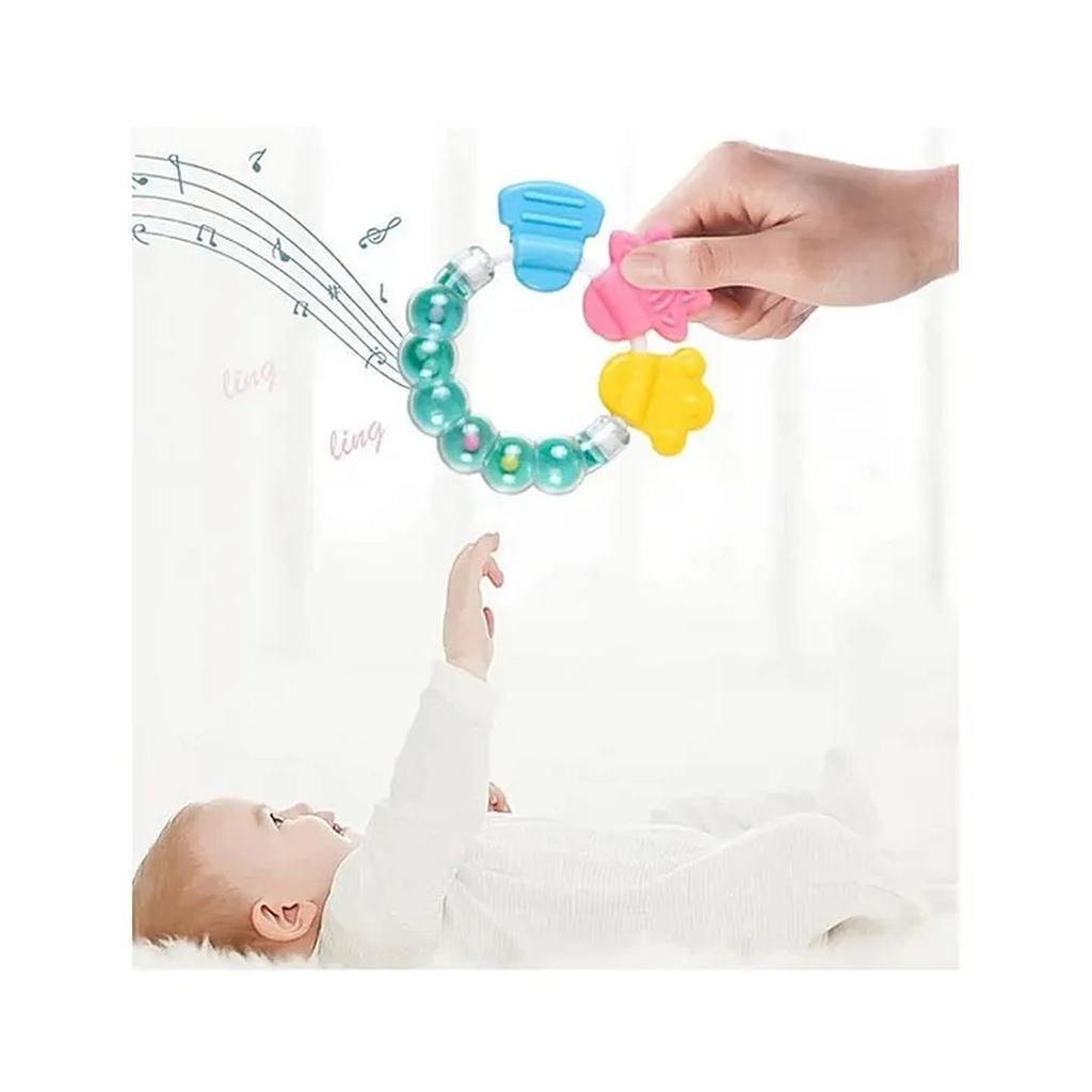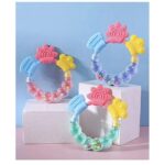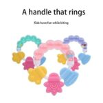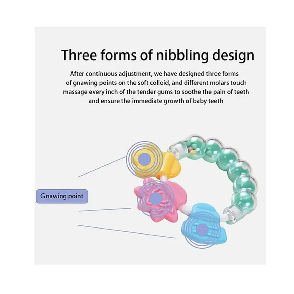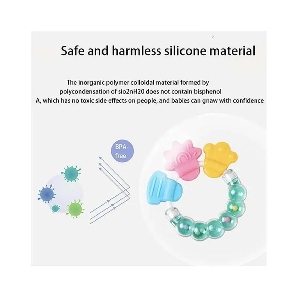 Soft teether toy for little baby. The Silicone part can play like a teether toy and the bracelet part can play like a bell. This teether ring can motivate the baby’s hand eye coordination, logical thinking ability and so on .This Silicone teether is BPA free Non Toxic and high temperature resistance. Before using this please wash up and disinfect into hot water for 3-5 minutes.”